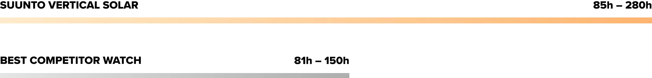 En usage quotidien, la montre Suunto Vertical vous accompagne jusqu’à 60 jours ; jusqu’à un an sans recharge dans la version solaire en titane !